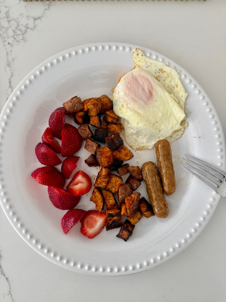 - Eggs + Chicken Sausage + Strawberries + Sweet Potato